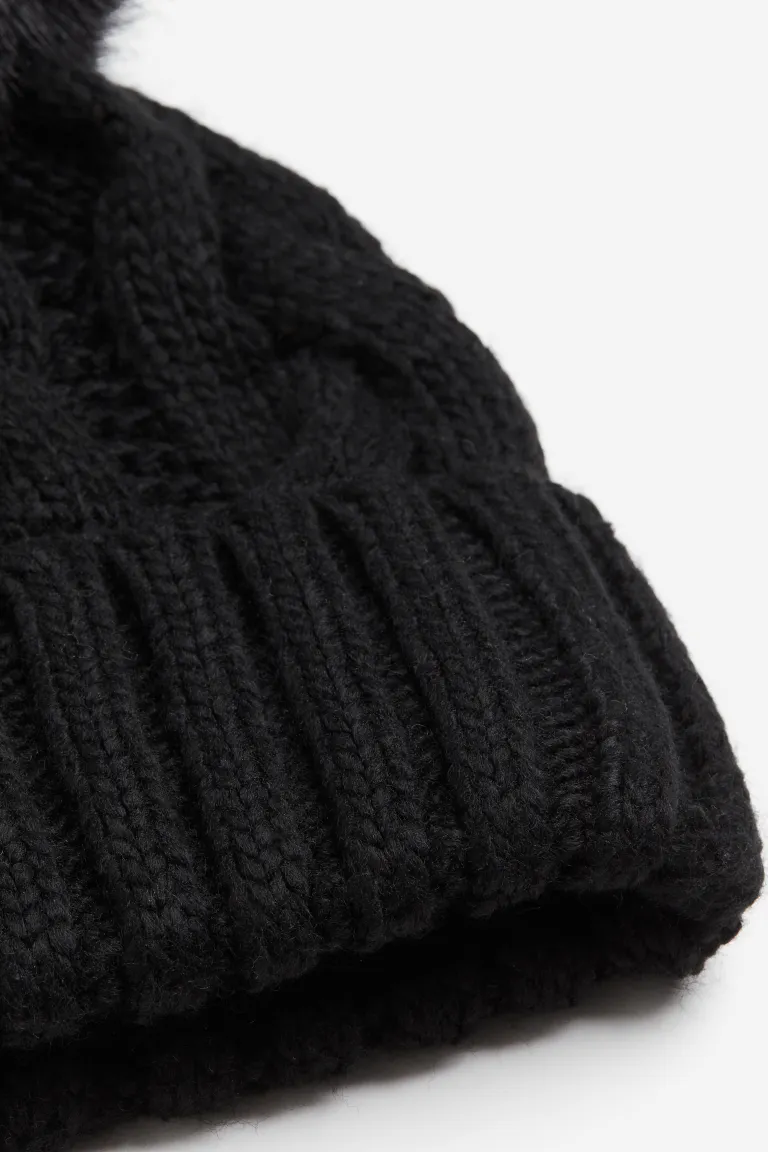 Hat in a soft cable knit with a fluffy pompom on top and a ribbed turn-up at the hem.