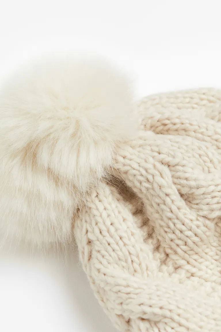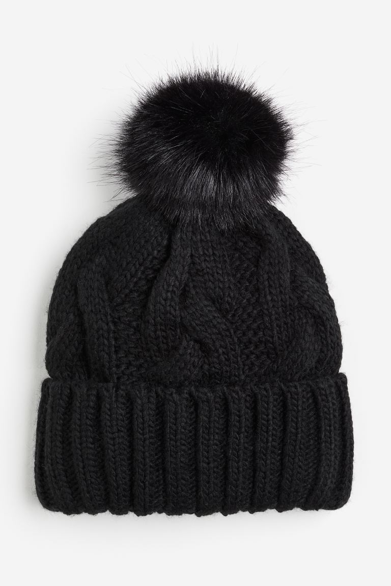 Hat in a soft cable knit with a fluffy pompom on top and a ribbed turn-up at the hem.