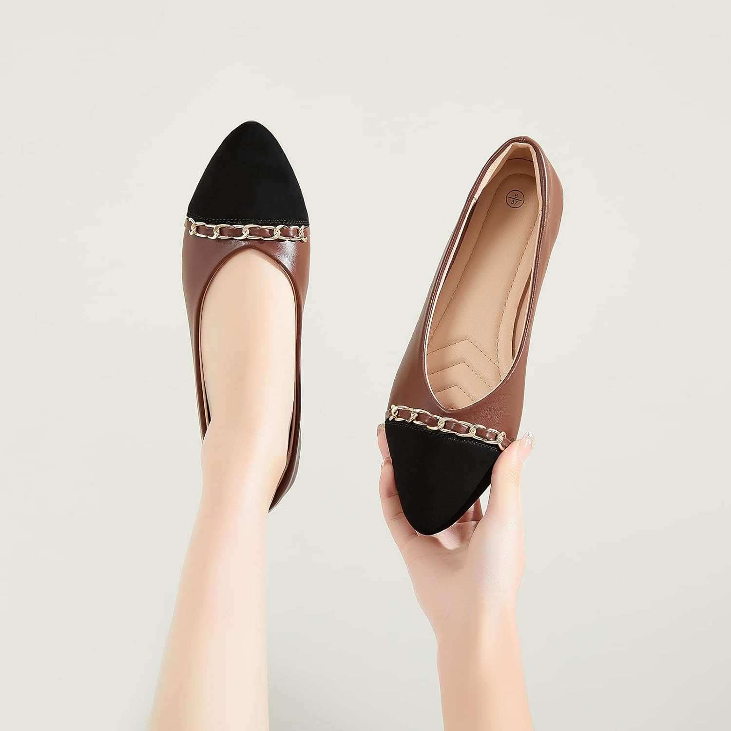 Stitching Design,Womens flats shoes are soft pu leather upper with stitching design.It has a crimping effect.We pay attention to the details of the product,the metal chain, smooth lines, while bringing you a unique flats design.
