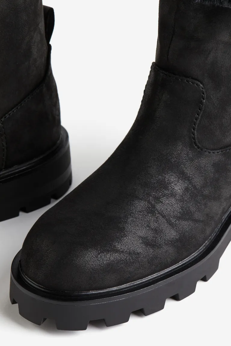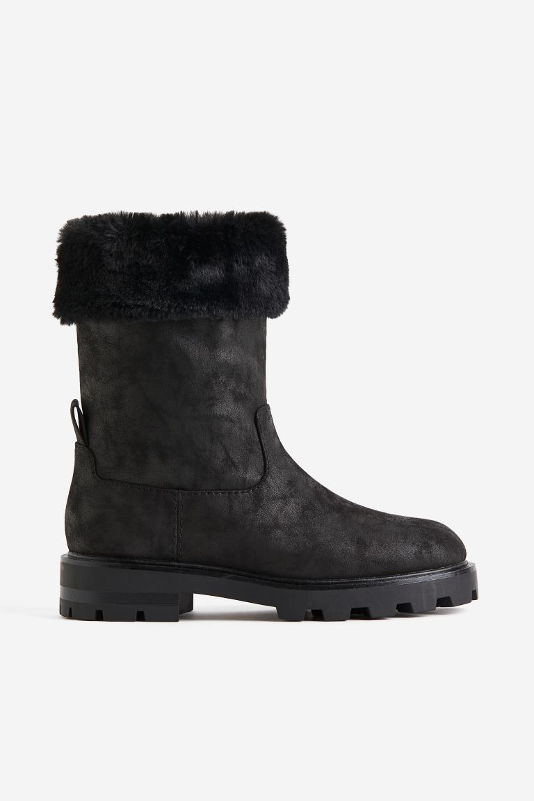 ①Ankle boots with rounded toes, a loop at the back and chunky, patterned soles.